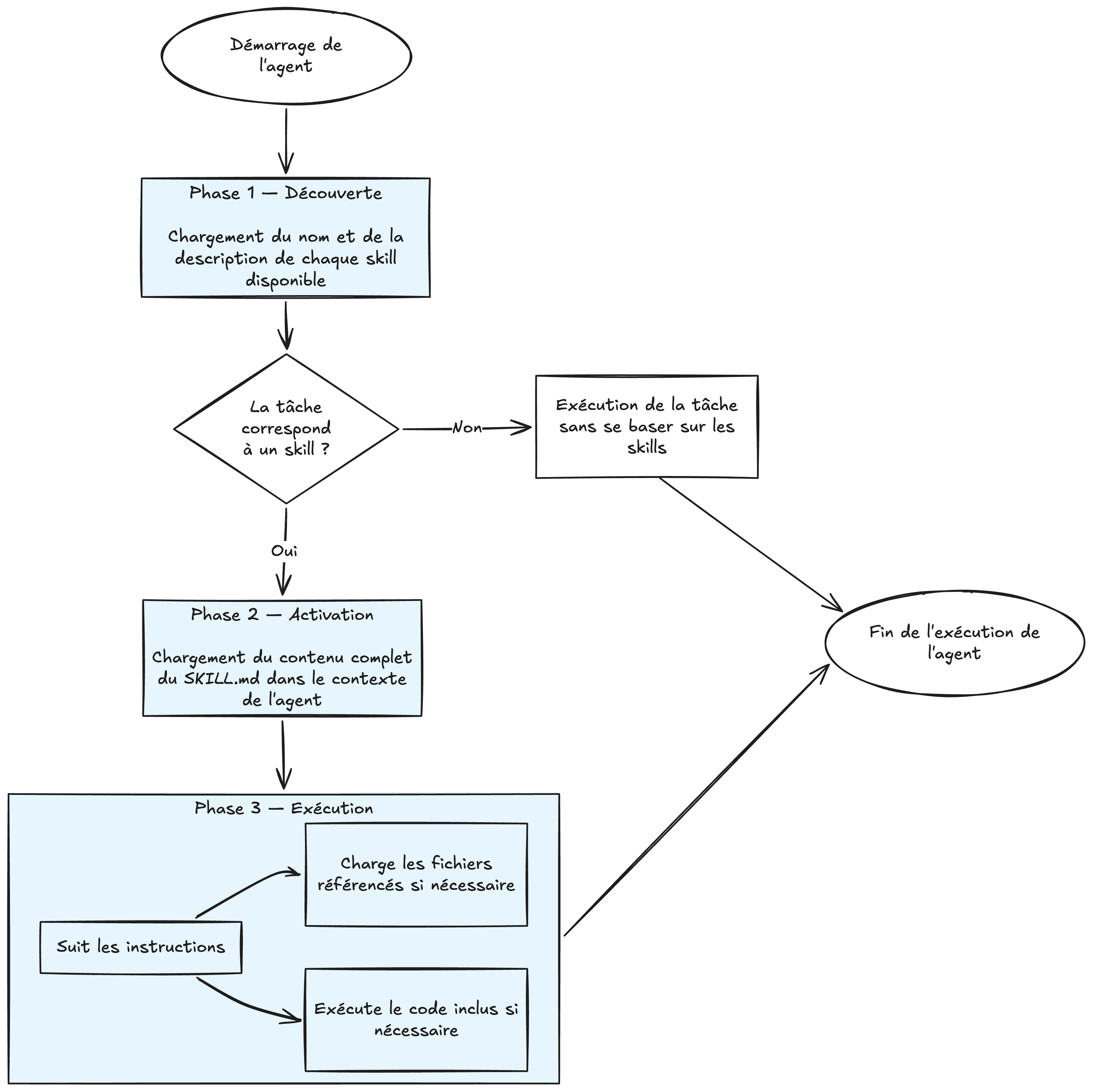 SKILL.md. - Phase 3 — Exécution : L’agent suit les instructions, charge des fichiers supplémentaires référencés dans le skill si besoin, et exécute du code si nécessaire.